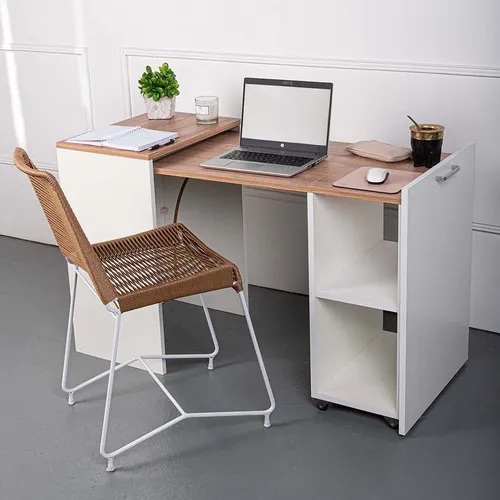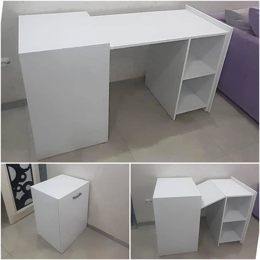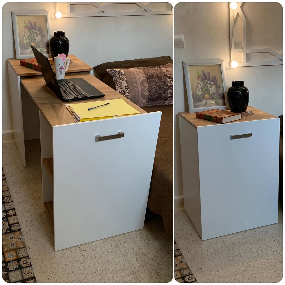 مكتب حديث وذكي يجمع بين التصميم الأنيق والوظيفة العملية. يمكن استخدامه كمكتب للعمل أو الدراسة، ومع حركة بسيطة يتحول إلى خزانة مدمجة لتخزين أغراضك.